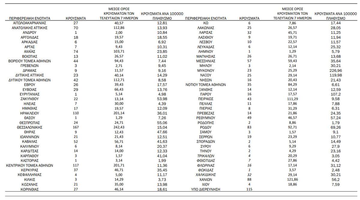 Τα νέα εργαστηριακά επιβεβαιωμένα κρούσματα της νόσου που καταγράφηκαν τις τελευταίες 24 ώρες είναι 1.888, εκ των οποίων 16 εντοπίστηκαν κατόπιν ελέγχων στις πύλες εισόδου της χώρας. Ο συνολικός αριθμός των κρουσμάτων ανέρχεται σε 537.125 (ημερήσια μεταβολή +0.4%), εκ των οποίων 51.2% άνδρες. Με βάση τα επιβεβαιωμένα κρούσματα των τελευταίων 7 ημερών, 134 θεωρούνται σχετιζόμενα με ταξίδι από το εξωτερικό και 2.082 είναι σχετιζόμενα με ήδη γνωστό κρούσμα.