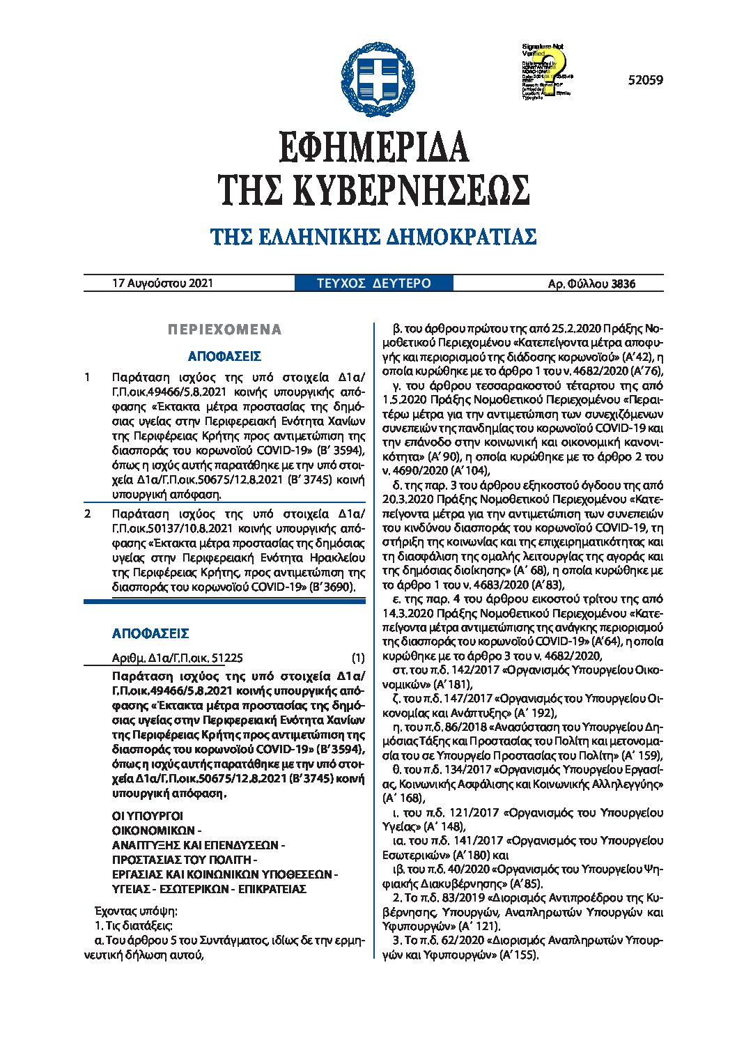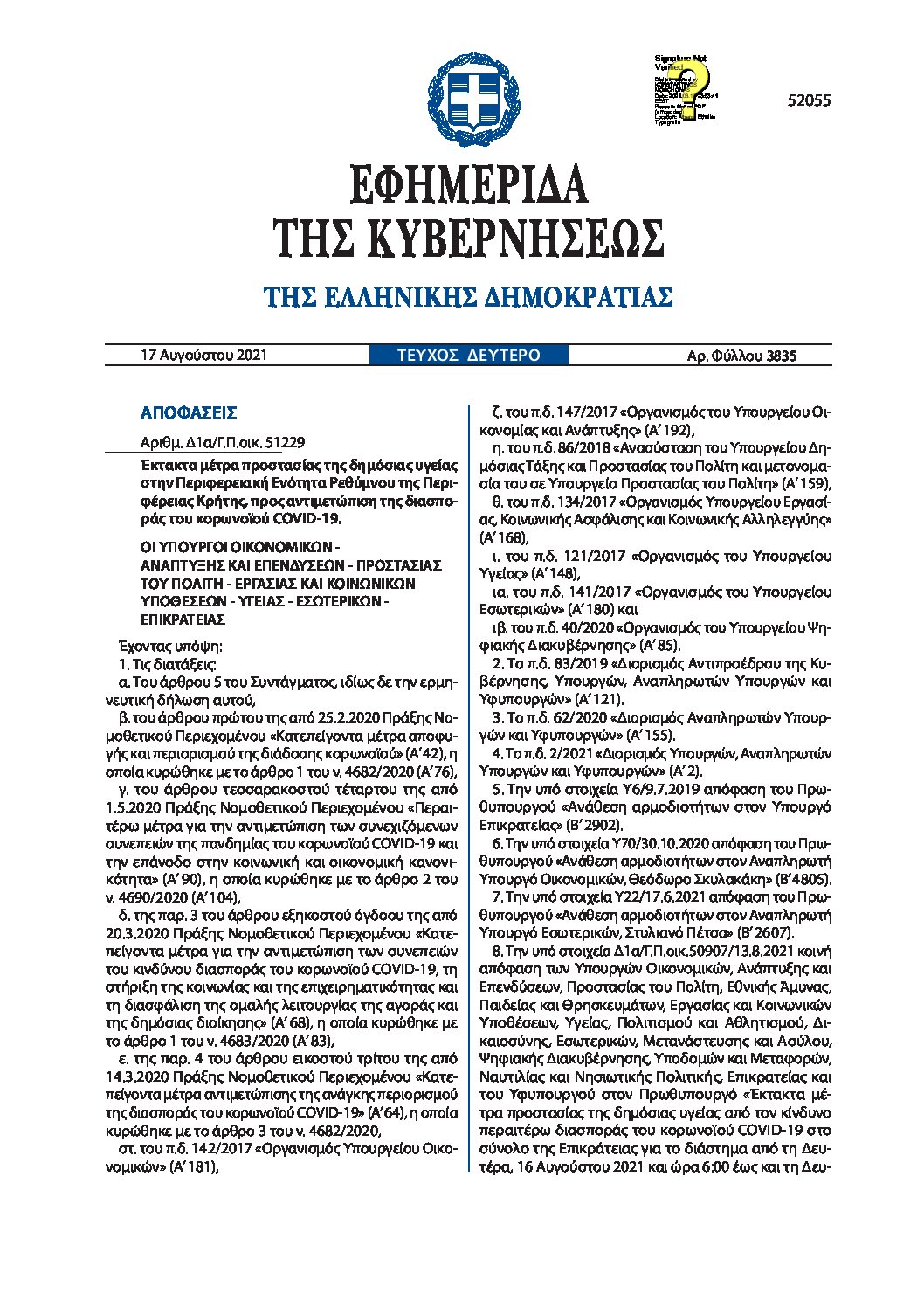 Τη νύχτα εκδόθηκαν δύο ΦΕΚ για τα “έκτακτα μέτρα προστασίας της δημόσιας υγείας” στην Περιφερειακή Ενότητα Ρεθύμνου, ενώ παρατείνονται τα μέτρα στις περιφερειακές ενότητες Ηρακλείου και Χανίων, ως και την Τετάρτη, 25 Αυγούστου 2021 και ώρα 06:00.