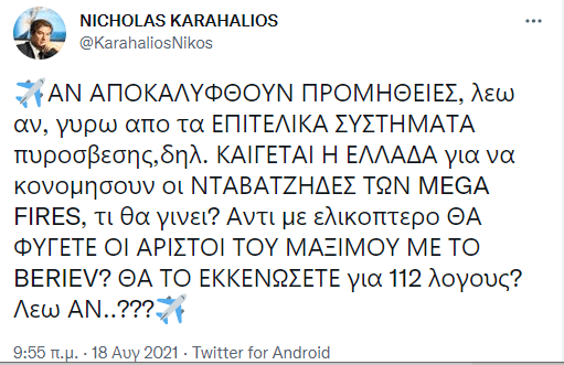 “ΑΝ ΑΠΟΚΑΛΥΦΘΟΥΝ ΠΡΟΜΗΘΕΙΕΣ, λεω αν, γυρω απο τα ΕΠΙΤΕΛΙΚΑ ΣΥΣΤΗΜΑΤΑ πυροσβεσης,δηλ. ΚΑΙΓΕΤΑΙ Η ΕΛΛΑΔΑ για να κονομησουν οι ΝΤΑΒΑΤΖΗΔΕΣ ΤΩΝ MEGA FIRES, τι θα γινει?”, γράφει, υπονοώντας σαφώς τι γνωρίζει.