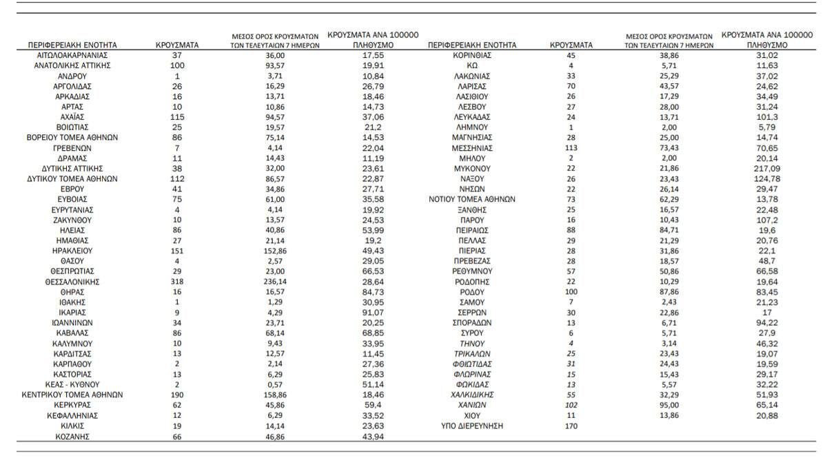 Τα νέα εργαστηριακά επιβεβαιωμένα κρούσματα της νόσου που καταγράφηκαν τις τελευταίες 24 ώρες είναι 3.273, εκ των οποίων 12 εντοπίστηκαν κατόπιν ελέγχων στις πύλες εισόδου της χώρας. Ο συνολικός αριθμός των κρουσμάτων ανέρχεται σε 550.459 (ημερήσια μεταβολή +0.6%), εκ των οποίων 51.1% άνδρες. Με βάση τα επιβεβαιωμένα κρούσματα των τελευταίων 7 ημερών, 128 θεωρούνται σχετιζόμενα με ταξίδι από το εξωτερικό και 1.409 είναι σχετιζόμενα με ήδη γνωστό κρούσμα.