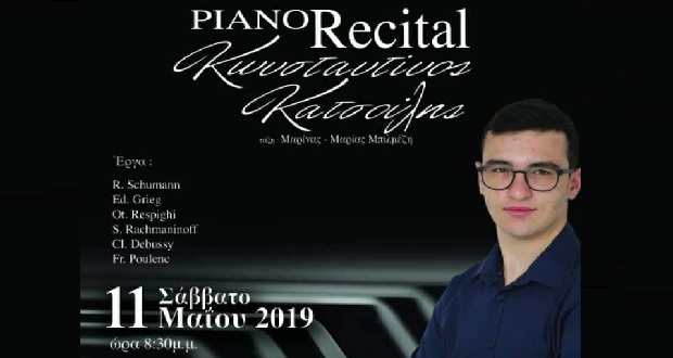 Ο 19χρονος Κρητικός Κωνσταντίνος Κατσούλης , φοιτητής του Τμήματος Μουσικών Σπουδών του Αριστοτελείου Πανεπιστημίου Θεσσαλονίκης, την Δευτέρα 23 Αυγούστου 2021 και ώρα 21.30 θα πραγματοποιήσει Recital Πιάνου στο Μινωικό Ανάκτορο Μαλίων (Αρχαιότητες Μαλίων).