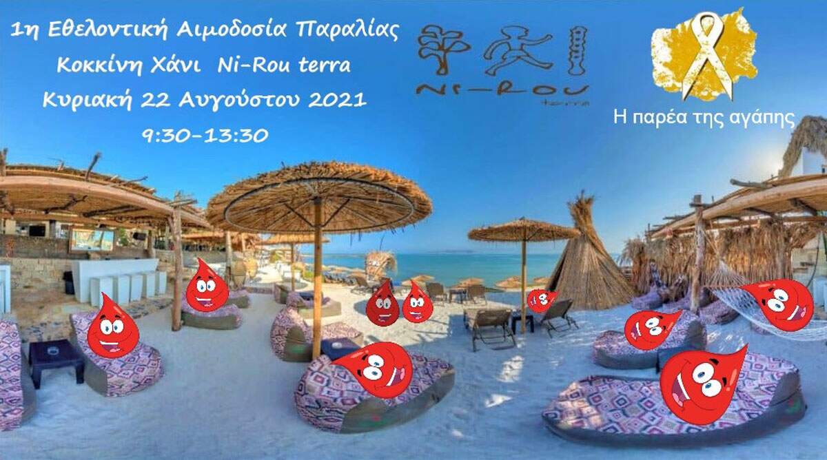 Αυτήν την Κυριακή 22 Αυγούστου (9:30-13:30) η Παρέα της Αγάπης σε συνεργασία με το τμήμα Αιμοδοσίας του Πανεπιστημιακού Νοσοκομείου Ηρακλείου σας προσκαλούν να επισκεφτείτε την παραλία Nirou Terra στο Κοκκίνη Χάνι, να κάνετε το μπάνιο σας και να δώσετε αίμα σε ανθρώπους που χρήζουν μετάγγισης.