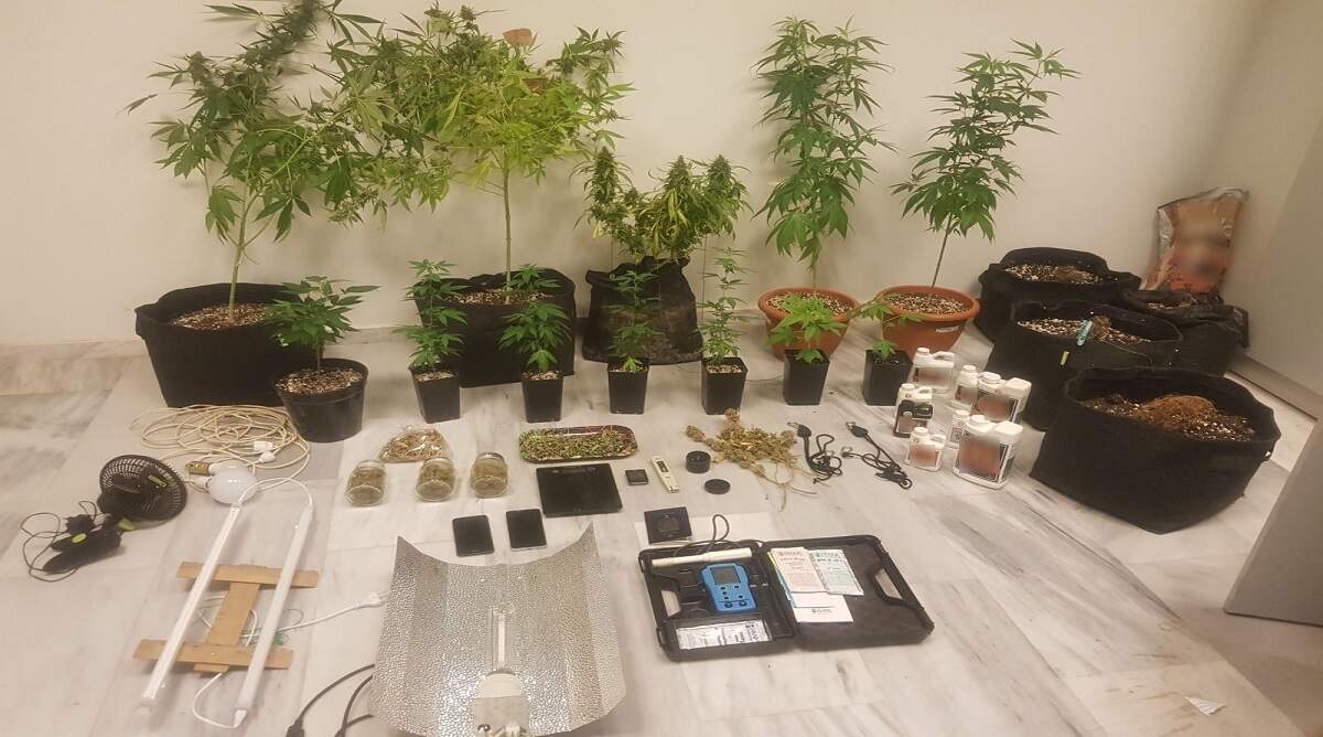 - 12 δενδρύλλια κάνναβης, ύψους έως 1,5 μέτρα στο στάδιο της ανάπτυξης, τα οποία καλλιεργούντο επιμελώς με τη μέθοδο της υδροπονίας σε ειδικά διαμορφωμένο χώρο,