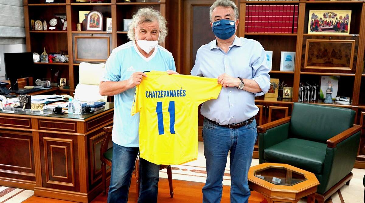 Ο παλαίμαχος άσος του ελληνικού ποδοσφαίρου Βασίλης Χατζηπαναγής επισκέφθηκε σήμερα τον Περιφερειάρχη Κρήτης Σταύρο Αρναουτάκη. Ο σπουδαίος Έλληνας ποδοσφαιριστής βρίσκεται στο Ηράκλειο στο πλαίσιο της επιμορφωτικής ημερίδας που διοργανώνουν ο ΓΣ Εργοτέλης και η Περιφέρεια Κρήτης στο γήπεδο «Νίκος Καζαντζάκης» του Μαρτινέγκο, την Τετάρτη 1 Σεπτεμβρίου στις 5 το απόγευμα.