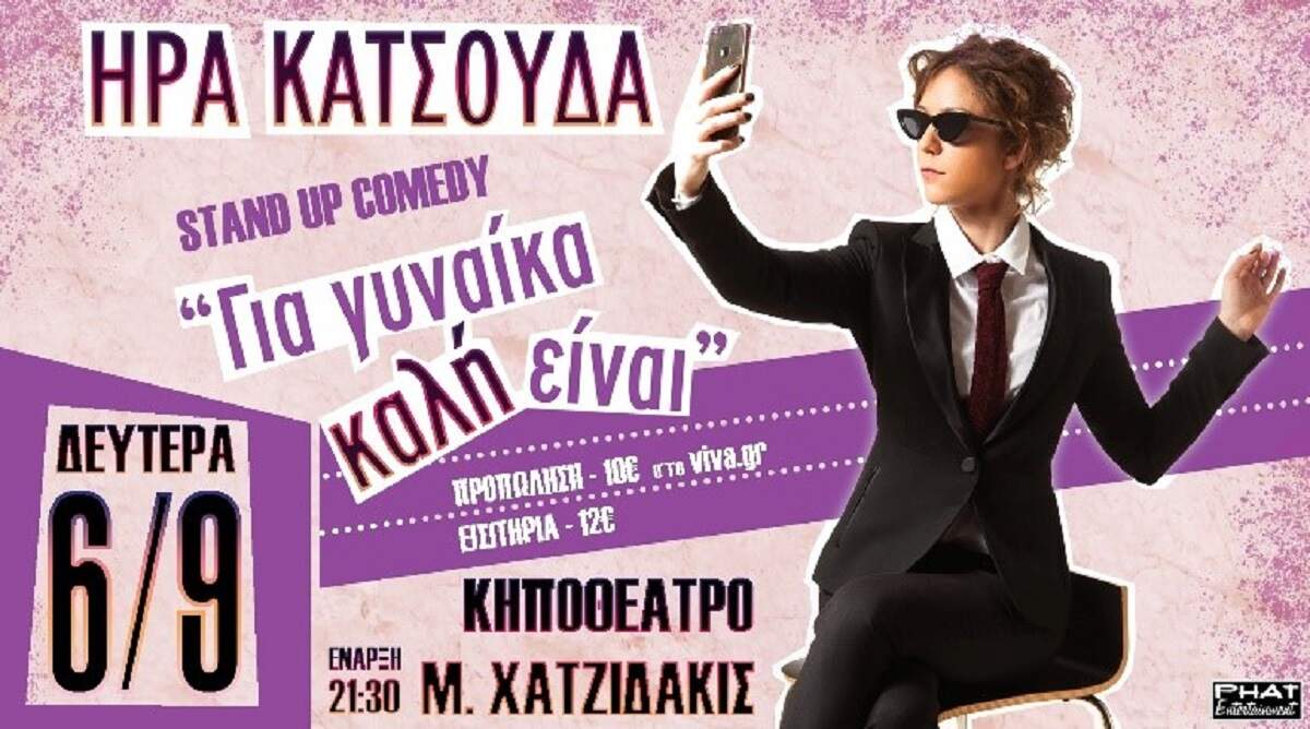 Η Ήρα Κατσούδα παρουσιάζει στο Ηράκλειο τη νέα σόλο παράσταση της «Για Γυναίκα, καλή είναι». Θίγει θέματα ισότητας των φύλων, κοινωνικά στερεότυπα, οικογένεια, διαζύγιο αλλά σε καμία περίπτωση μόνο αυτά. Πρόκειται για παράσταση Stand Up Comedy για τη Δευτέρα 6 Σεπτεμβρίου στο κηποθέατρο «Μ. Χατζιδάκις» στο πλαίσιο των εκδηλώσεων «Ηράκλειο- Καλοκαίρι 2021»