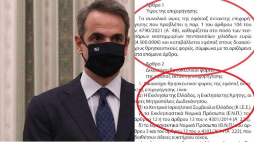 Το δεύτερο, μέσα σε λίγους μήνες, έκτακτο δωράκι 4.500.000 € κρατικό χρήμα από τον Κυριάκο Μητσοτάκη στην Εκκλησία της Ελλάδας και της Κρήτης, αλλά και σε άλλους θρησκευτικούς φορείς όπως το Κεντρικό Ισραηλιτικό Συμβούλιο της Ελλάδος! Το σχετικό ΦΕΚ δημοσιεύτηκε χθες και είναι η συνέχεια μιας ανάλογης απόφαση που πάρθηκε στις 30 το περασμένου Μαρτίου με την οποία οι ίδιοι…