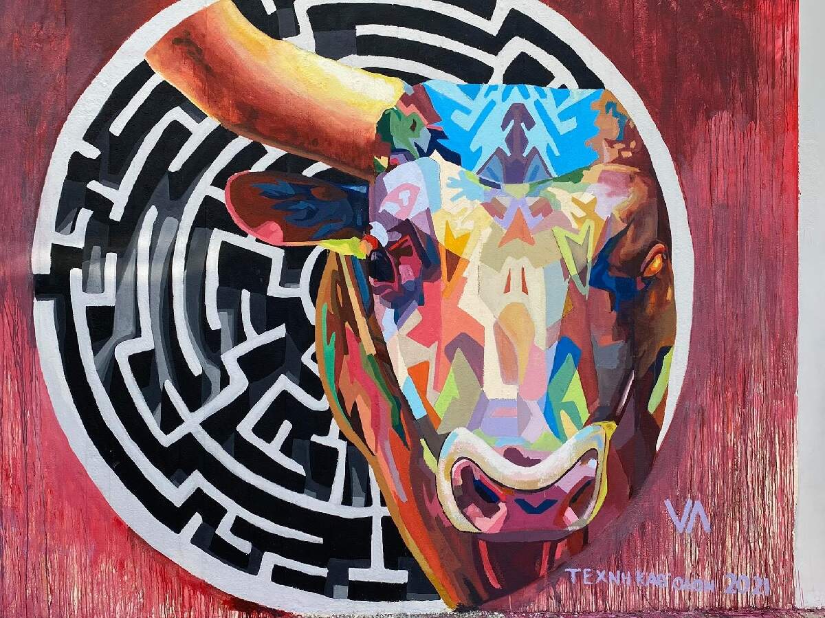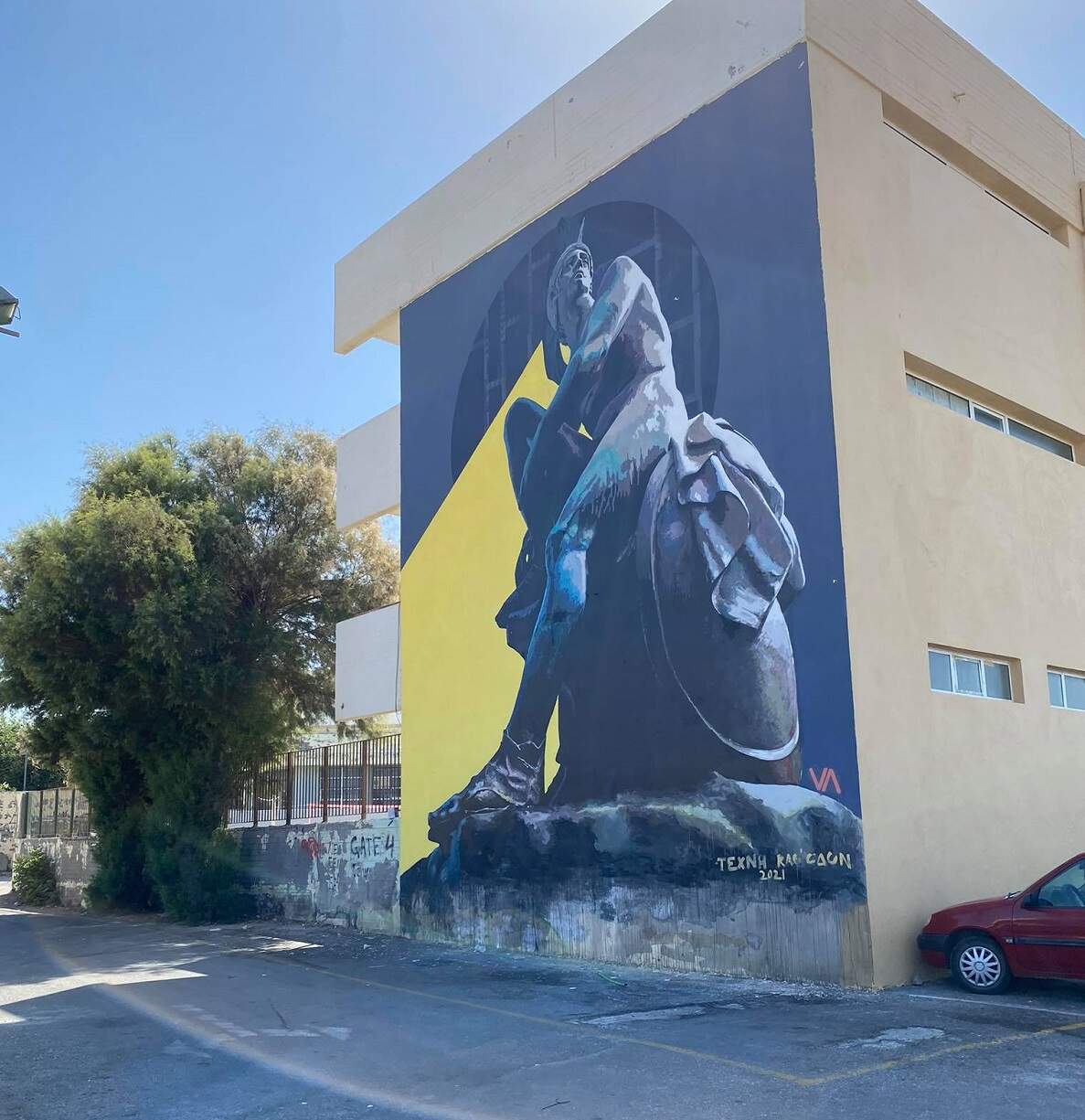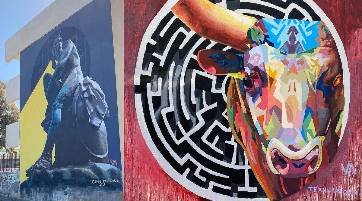 Εντυπωσιάζει η νέα τοιχογραφία με θέμα τον «Θησέα» στο σχολικό συγκρότημα «Τάλως» η όποια δημιουργήθηκε στο πλαίσιο του Φεστιβάλ «Τέχνη Καθ’ Οδόν» 2021 από την καλλιτεχνική ομάδα VV Crew.