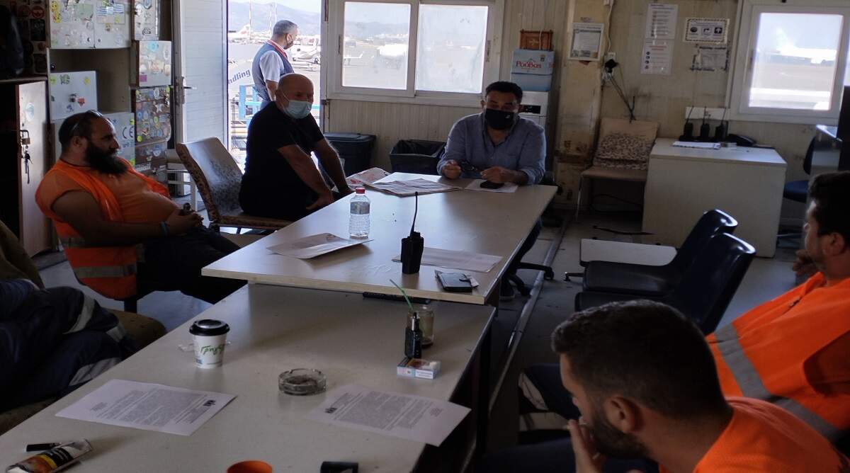 Η αντιπροσωπεία του Κόμματος συναντήθηκε με τον αναπληρωτή αερολιμενάρχη Χρήστο Ρέππα και στη συνέχεια πραγματοποίησε περιοδεία στους χώρους του διαχωρισμού των αποσκευών και των αποδυτηρίων των εργατών και του προσωπικού καθαρισμού των αεροσκαφών.