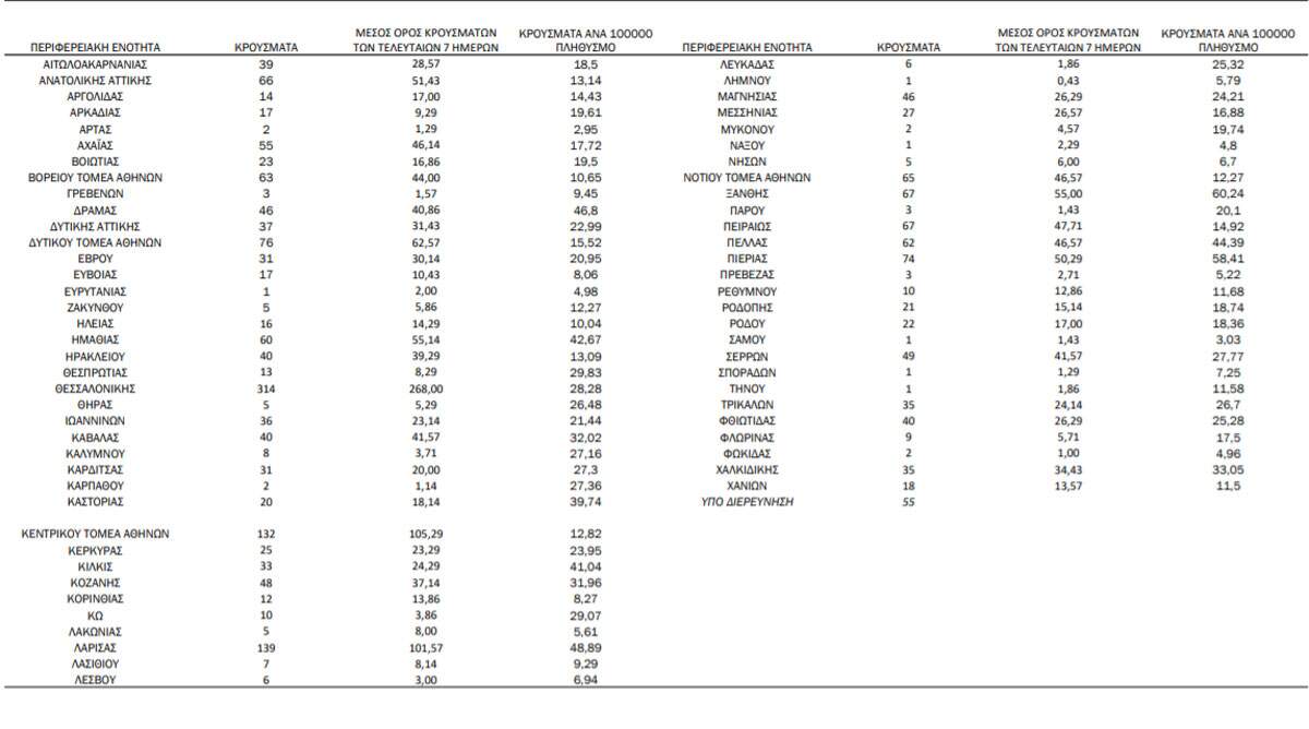 Τα νέα εργαστηριακά επιβεβαιωμένα κρούσματα της νόσου που καταγράφηκαν τις τελευταίες 24 ώρες είναι 2.232, εκ των οποίων 2 εντοπίστηκαν κατόπιν ελέγχων στις πύλες εισόδου της χώρας. Ο συνολικός αριθμός των κρουσμάτων ανέρχεται σε 655.767 (ημερήσια μεταβολή +0.3%), εκ των οποίων 50.9% άνδρες. Με βάση τα επιβεβαιωμένα κρούσματα των τελευταίων 7 ημερών, 71 θεωρούνται σχετιζόμενα με ταξίδι από το εξωτερικό και 3.205 είναι σχετιζόμενα με ήδη γνωστό κρούσμα.