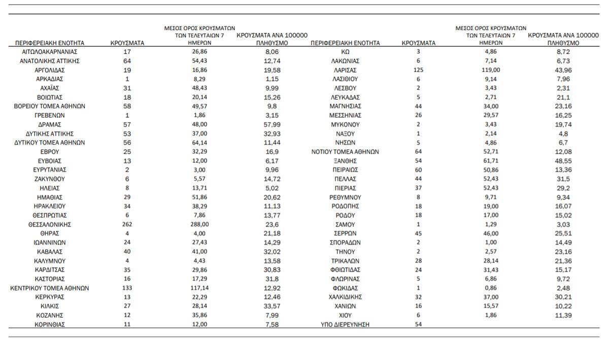 Με βάση τα επιβεβαιωμένα κρούσματα των τελευταίων 7 ημερών, 77 θεωρούνται σχετιζόμενα με ταξίδι από το εξωτερικό και 3.183 είναι σχετιζόμενα με ήδη γνωστό κρούσμα.