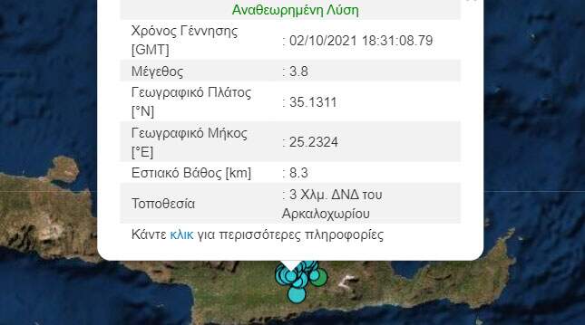 Νέα σεισμική δόνηση σημειώθηκε πριν από λίγα λεπτά στην περιοχή του Αρκαλοχωρίου, η οποία έγινε αισθητή και στο Ηράκλειο.