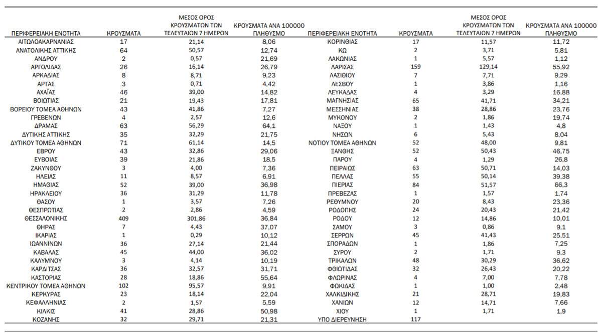 Με βάση τα επιβεβαιωμένα κρούσματα των τελευταίων 7 ημερών, 112 θεωρούνται σχετιζόμενα με ταξίδι από το εξωτερικό και 2.984 είναι σχετιζόμενα με ήδη γνωστό κρούσμα.