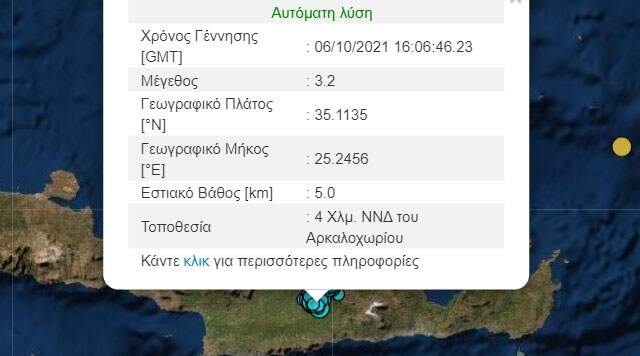 Νέα σισμική δόνηση μεγέθους 3.2 Ρίχτερ σημειώθηκε την Τετάρτη στις 19:06 μ.μ., σε απόσταση 4 χλμ. νότια – νοτιοδυτικά του Αρκαλοχωρίου και με εστιακό βάθος 5 χλμ.