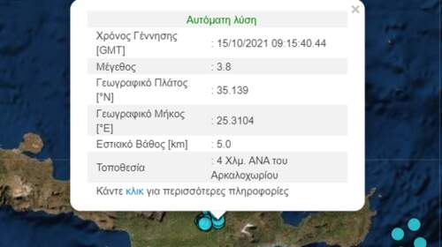 Σεισμική δόνηση έγινε ιδιαίτερα αισθητή στο Ηράκλειο στις 12.15 το μεσημέρι της Παρασκευής. Σύμφωνα με το Γεωδυναμικό Ινστιτούτο ο σεισμός ήταν εντάσεως 3, 8 Ρίχτερ και το επίκεντρό του εντοπίζεται 4 χλμ ανατολικά, νοτιοανατολικά του Αρκαλοχωρίου. Το εστιακό βάθος υπολογίζεται σε 5 χλμ.