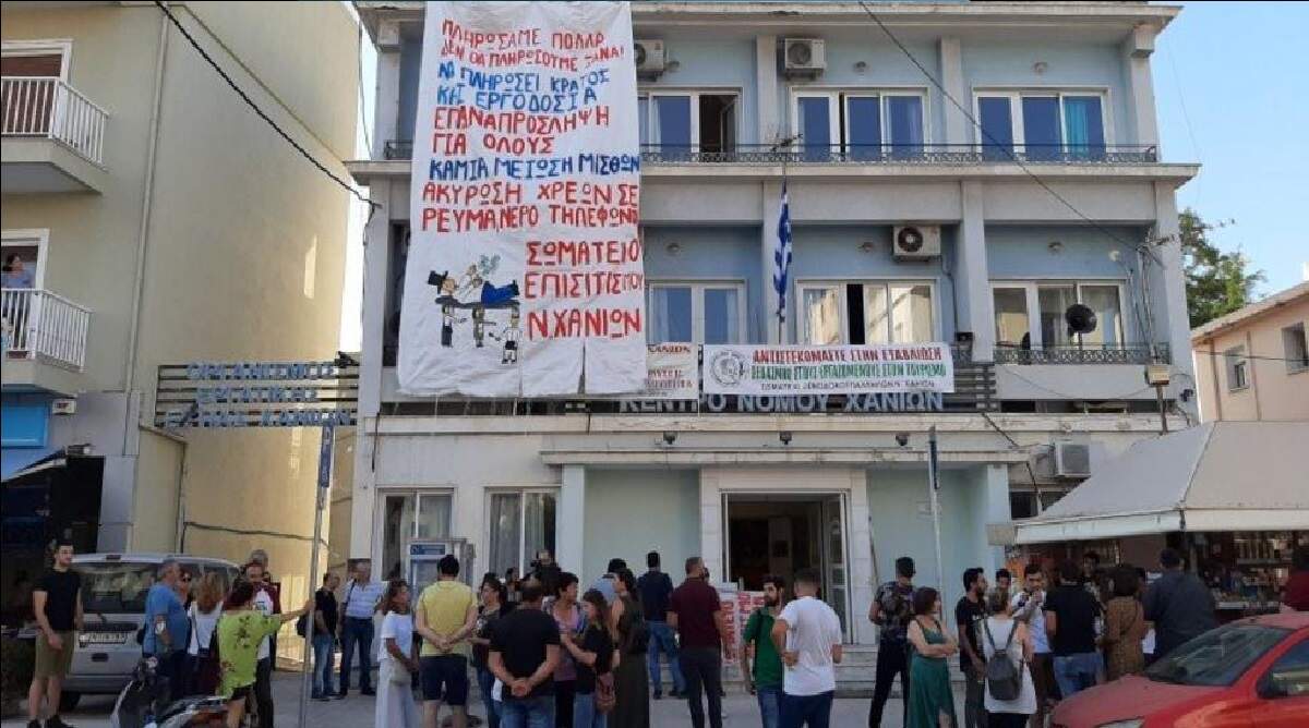 (Από τη συγκέντρωση διαμαρτυρίας στο Εργατικό Κέντρο Χανίων- φωτο flashnews.gr)