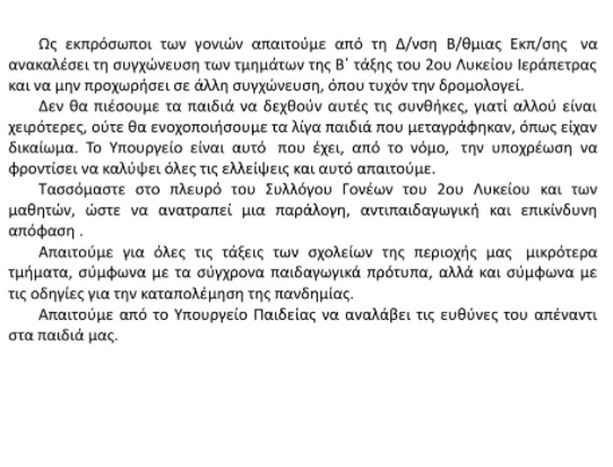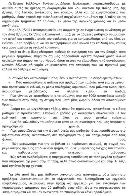 H επιστολή της Ένωσης Συλλογών Γονέων Ιεράπετρας