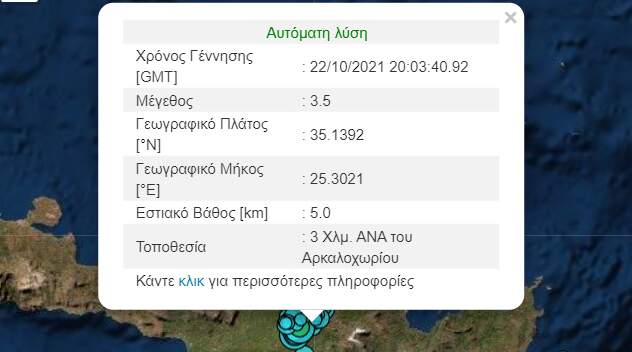 Σύμφωνα με το Γεωδυναμικό Ινστιτούτο, ο σεισμός ήταν έντασης 3, 5 Ρίχτερ και είχε επίκεντρο 3 Χλμ. Ανατολικά – Νοτιοανατολικά του Αρκαλοχωρίου. Τι εστιακό βάθος εντοπίζεται στα 5 χλμ.