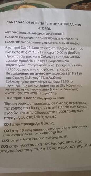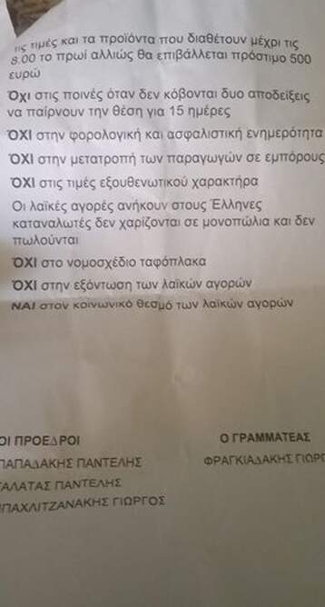 Το κοινό κάλεσμα που εξέδωσαν η Ομοσπονδία λαϊκών αγορών Κρήτης, ο σύλλογος εμπόρων νωπών προιόντων ν. Ηρακλείου και ο σύλλογος εμπόρων βιοτεχνικών ειδών Ν. Ηρακλείου:
