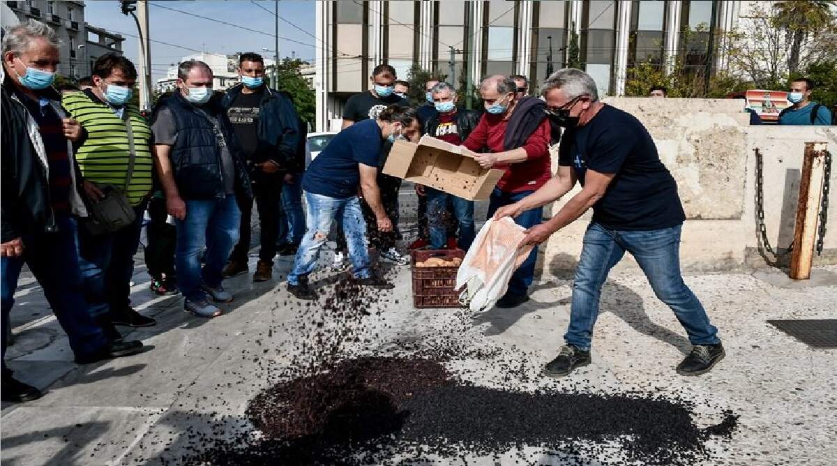Σε μία συμβολική κίνηση αγρότες από πυρόπληκτες περιοχές πέταξαν πατάτες και σταφίδες μπροστά από το κοινοβούλιο.