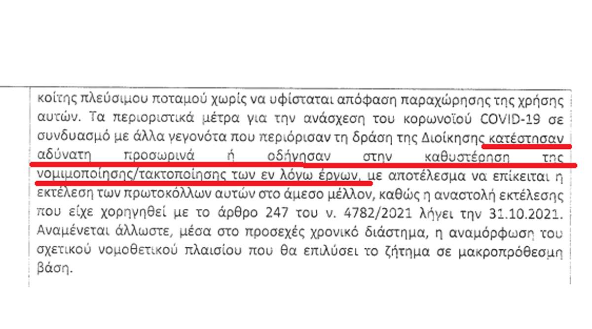 Εκτός από την κουτοπόνηρη αυτή τακτική της ομηρείας, η κυβέρνηση ισχυρίζεται ότι η παράταση δίνεται για να προχωρήσει σε νομιμοποίηση/ τακτοποίηση των αυθαιρεσιών, πράγμα που απαγορεύεται ρητά από το Σύνταγμα. Όποια προσπάθεια και να κάνει, θα ακυρωθεί στο ΣτΕ γιατί η απαγόρευση είναι ρητή. Εκτός αυτού, όλες αυτές οι υποθέσεις κατεδαφίσεων είναι δικαστικές αποφάσεις που έχουν τελεσιδικήσει μετά από πολλά χρόνια. Φαίνεται λοιπόν πως πρόθεση της κυβέρνησης δεν είναι να χρηματοδοτήσει τις αναπλάσεις και να προχωρήσει στην αποκατάσταση των παρανομιών, αλλά να διατηρήσει σε ομηρεία τα καταστήματα εστίασης για να συγκαλύπτει τις μεγάλες παρανομίες των καταπατητών – “πελατών” της. Για του λόγου το αληθές, επισυνάπτουμε και την αιτιολογική έκθεση της τροπολογίας που αναφέρει ακριβώς το σχεδιασμό της κυβέρνησης. Αιτία για όλα αυτά βέβαια είναι ο … κορωνοϊός!