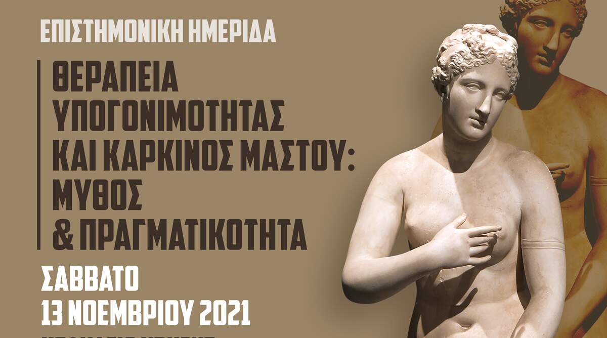 Υπό την αιγίδα της Περιφέρειας Κρήτης, η Ελληνική Εταιρεία Αναπαραγωγικής Ιατρικής διοργανώνει Ημερίδα με θέμα Θεραπεία Υπογονιμότητας και Καρκίνος Μαστού: Μύθος & Πραγματικότητα, το Σάββατο 13 Νοεμβρίου 2021 στις αίθουσες ΣΥΜΠΟΣΙΑ Ι & ΙΙ του Μεγάρου ΝΤΟΡΕ. Η Ημερίδα θα διεξαχθεί υβριδικά Η Ημερίδα θα πραγματοποιηθεί υβριδικά και η εγγραφή είναι δωρεάν. Σχετικά με τη διαδικτυακή παρακολούθηση της Ημερίδας, η εγγραφή γίνεται στο site: www.cretancongress.support/therapeia-ypogonimothtas-kai-karkinos-mastou