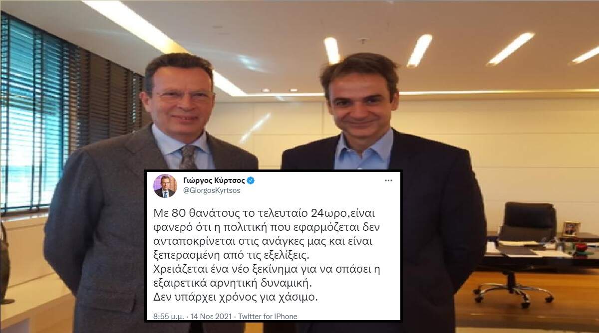 Όσο κι αν ο πρωθυπουργός και η κυβέρνηση επιμένουν στη γραμμή που θέλει την πανδημία να είναι υπό έλεγχο στην Ελλάδα ο ευρωβουλευτής της Νέας Δημοκρατίας Γιώργος Κύρτσος σχολιάζει: «Είναι φανερό ότι η πολιτική που εφαρμόζεται δεν ανταποκρίνεται στις ανάγκες μας και είναι ξεπερασμένη από τις εξελίξεις» λέει με αφορμή την τελευταία ανακοίνωση του ΕΟΔΥ για 80 νεκρούς από κορονοϊό το τελευταίο 24ωρο.
