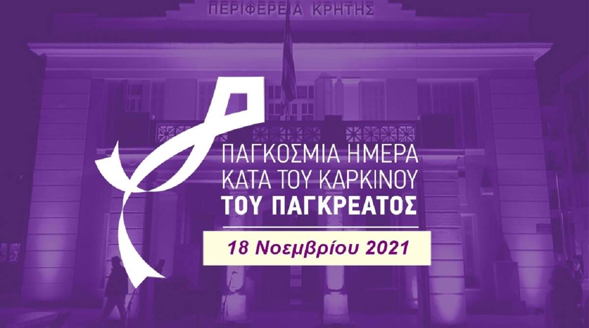 Στο πλαίσιο της φετινής 8ης Παγκόσμιας Ημέρας Παγκρεατικού Καρκίνου, ο Σύλλογος «Ευ Ζω με τον Καρκίνο» και η Περιφέρεια Κρήτης πραγματοποιούν εκδήλωση την Πέμπτη 18 Νοεμβρίου 2021 και ώρα 18:30 το απόγευμα. Συγκεκριμένα το κτίριο της Περιφέρειας Κρήτης θα φωταγωγηθεί με μωβ χρώμα, συμμετέχοντας στο παγκόσμιο κίνημα που συσπειρώνει 93 οργανώσεις καρκίνου από 35 χώρες και 6 ηπείρους.