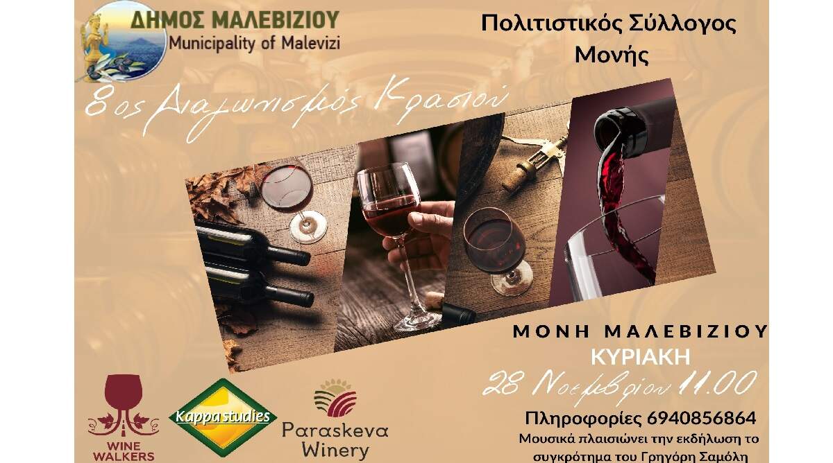 Ο Δήμος Μαλεβιζίου σε συνεργασία με τον Πολιτιστικό Σύλλογο Μονής διοργανώνουν την Κυριακή 28 Νοεμβρίου τον 8ο Διαγωνισμό Κρασιού φετινής σοδειάς.