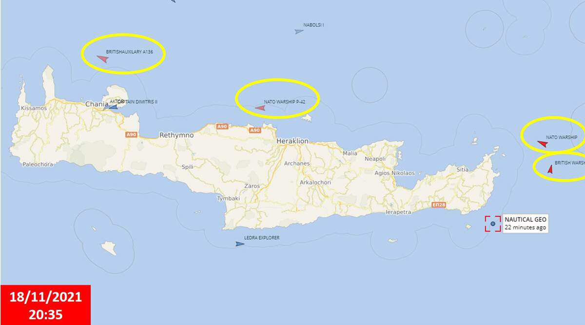 Το ερευνητικό πλοίο NAUTICAL GEO το οποίο εκτελεί εργασίες μέτρησης για την κοινοπραξία του αγωγού Eastmed αφού ολοκλήρωσε τις εργασίες του στην ΑΟΖ της Κυπριακής Δημοκρατίας, από τις πρωϊνές ώρες της Πέμπτης βρίσκεται αγκυροβολημένο  στα 6 ναυτικά μίλια Ανατολικά της Κρήτης σε αναμονή για έκδοση NAVTEX από τις ελληνικές αρχές για να συνεχίσει τις εργασίες του.Μαζί όμως με το NAUTICAL GEO ήρθε και η συνήθης συνοδεία από πολεμικό πλοίο (Φρεγάτα) του τουρκικού ΠΝ.Επαναλαμβάνεται δηλαδή το σκηνικό του Σεπτεμβρίου όταν τουρκικά πολεμικά επιτηρούσαν από απόσταση το πλοίο και δεν δίστασαν να το καλέσουν μέσω ασυρμάτου να δηλώσει τα στοιχεία του διότι “βρίσκεται σε περιοχή τουρκικής δικαιοδοσίας”.