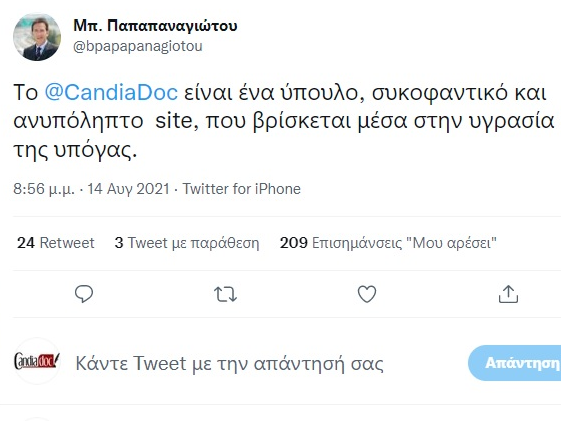 “Το @CandiaDoc είναι ένα ύπουλο, συκοφαντικό και ανυπόληπτο site, που βρίσκεται μέσα στην υγρασία της υπόγας”, απεφάνθη ο “μέγας”! Όπου ως “υπόγα” εννοεί την Αριστερά και τον ΣΥΡΙΖΑ.