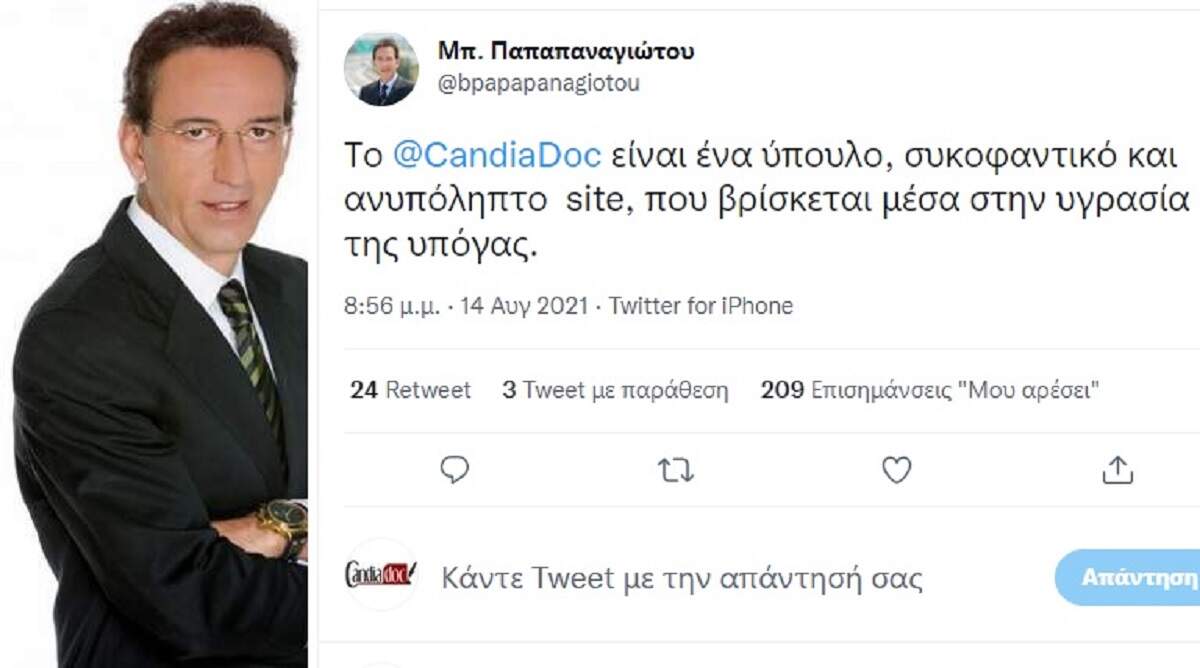 Ενημερωθήκαμε καθυστερημένα, γιατί δε γίνεται να παρακολουθούμε και όλους αυτούς τους τύπους που περιφέρονται στην αυλή του Μητσοτάκη. Ο γνωστός “αστέρας”, κάποτε σύμβουλος του, Μπάμπης Παπαπαναγιώτου, που αν παρακολουθήσετε τις παρεμβάσεις του στα κοινωνικά δίκτυα θα διαπιστώσετε τι μπόχα βγαίνει από το στόμα του, τα ΄έβαλε με αισχρό τρόπο με το Candiadoc.