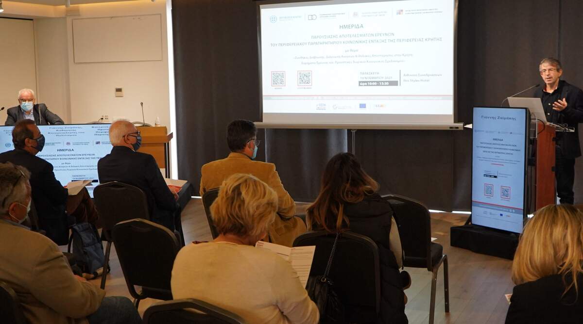 Πραγματοποιήθηκε με μεγάλη συμμετοχή και ενδιαφέρον η ημερίδα παρουσίασης των αποτελεσμάτων των ερευνών του Περιφερειακού Παρατηρητηρίου Κοινωνικής Ένταξης, με θέμα: «Συνθήκες Διαβίωσης, Διάγνωση Αναγκών & Θύλακες Αποστέρησης στην Κρήτη: Ευρήματα Έρευνας και Προοπτικές Χωρικού Κοινωνικού Σχεδιασμού»