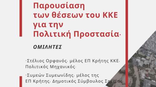 Η Κομματική Οργάνωση Λασιθίου του ΚΚΕ, οργανώνει εκδήλωση με θέμα: «Παρουσίαση των θέσεων του ΚΚΕ για την πολιτική προστασία», η οποία θα πραγματοποιηθεί το Σάββατο 27 Νοεμβρίου, στις 18:00 στο Πολύκεντρο Σητείας με ομιλητές, τους: -Στέλιο Ορφανό, μέλος της ΕΠ Κρήτης του ΚΚΕ, πολιτικό μηχανικό και –Σίμο Συμεωνίδη, μέλος της ΕΠ Κρήτης του ΚΚΕ, δημοτικό σύμβουλο Σητείας. Θα ακολουθήσει ανοιχτή…