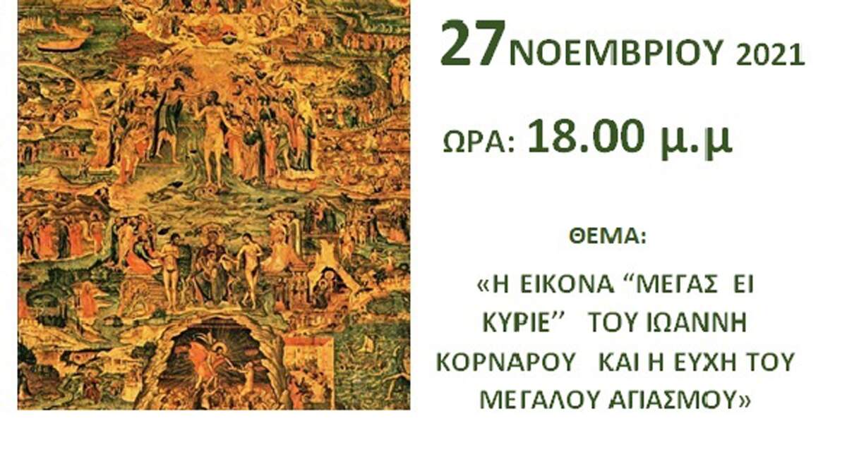 Ο Δήμος Χερσονήσου, ο Πολιτιστικός Σύλλογος Επισκοπής και το Κ.ΟΙ.ΠΟ.ΔΙ Χερσονήσου διοργανώνουν εσπερίδα με θέμα: «Η εικόνα «Μέγας ει Κύριε» του Ιωάννη Κορνάρου και η ευχή του Μεγάλου Αγιασμού», το Σάββατο 27 Νοεμβρίου και ώρα 18.00, στην αίθουσα του Συνεταιρισμού στην Επισκοπή.