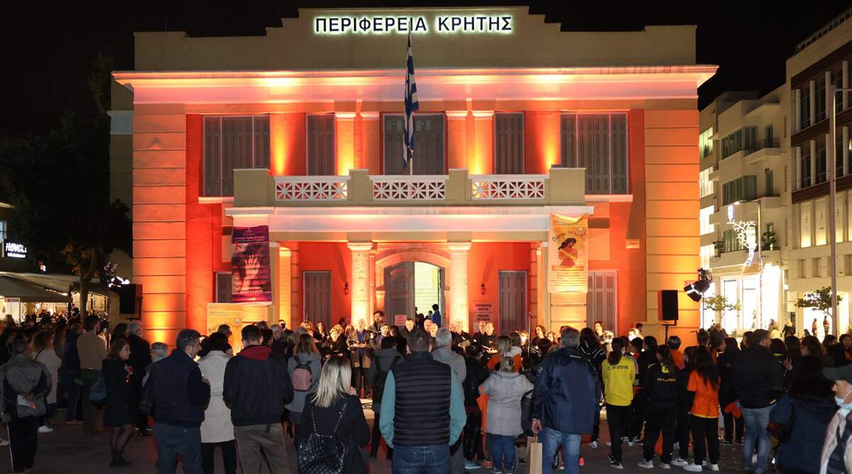 Ηχηρό μήνυμα κατά της βίας των γυναικών, έστειλαν χθες θεσμικοί εκπρόσωποι, μαθητές και πολίτες μέσα από τις εκδηλώσεις και δράσεις της Περιφέρειας Κρήτης σε συνεργασία με Δήμους, γυναικεία σωματεία, Επιτροπές Ισότητας, τον Ξενώνα Φιλοξενίας Γυναικών Δήμου Ηρακλείου και το Συμβουλευτικό Κέντρο Γυναικών Ηρακλείου. Παράλληλα παρουσία του Περιφερειάρχη Κρήτης Σταύρου Αρναουτάκη φωταγωγήθηκε με πορτοκαλί χρώμα το κεντρικό κτίριο της Περιφέρειας Κρήτης στην πλατεία Ελευθερίας στο Ηράκλειο στο πλαίσιο του εορτασμού για την «Παγκόσμια Ημέρα για την Εξάλειψη της Βίας κατά των Γυναικών», που τιτλοφορείται με το κεντρικό σύνθημα: «Βάφουμε τον Κόσμο Πορτοκαλί-Ενώνουμε Δυνάμεις-Τερματίζουμε τη Βία κατά των γυναικών τώρα». Η φωταγώγηση του κεντρικού κτιρίου της Περιφέρειας συνδυάστηκε με ενημέρωση, μηνύματα, μουσική και δρώμενα, σηματοδοτώντας την έναρξη των 16ήμερων εκδηλώσεων-δράσεων της Περιφέρειας Κρήτης.