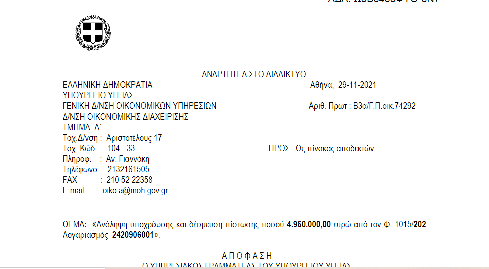 Μόλις χθες ολοκληρώθηκε ο έλεγχος από τις οικονομικές υπηρεσίες του υπουργείου Υγείας της απόφασης με την οποία ο υπηρεσιακός γραμματέας του υπουργείου Υγείας είχε εγκρίνει τη δαπάνη και τη δέσμευση του ποσού αυτού σε βάρος της πίστωσης του προϋπολογισμού εξόδων του Υπουργείου Υγείας οικονομικού έτους 2021.
