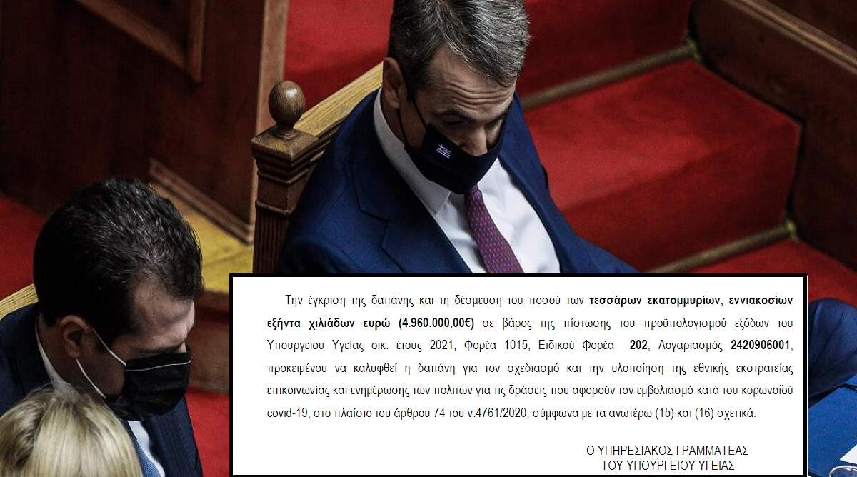 Ο υπουργός Υγείας Θάνος Πλεύρης και ο αναπληρωτής Υπουργός Οικονομικών Υγείας Θόδωρος Σκυλακάκης υπέγραψαν στις 22 Νοεμβρίου 2021 απόφαση για καμπάνια «διαμόρφωσης θετικής πεποίθησης και ενεργού συμμετοχής των πολιτών στον εμβολιασμό έναντι του κορωνοϊού COVID-19» που αφορά στην ανάθεση εκστρατείας επικοινωνίας και ενημέρωσης των πολιτών για τις δράσεις που θα αναληφθούν σχετικά με τον εμβολιασμό κατά του covid-19… Η δαπάνη των 4.960.000 ευρώ (4.000.000 ευρώ συν 960.000 ευρώ ΦΠΑ) θα βαρύνει τον προϋπολογισμό του Υπουργείου Υγείας και θα καλυφθεί με έκτακτη οικονομική ενίσχυση, από τις πιστώσεις για δράσεις που σχετίζονται με την υλοποίηση μέτρων προστασίας της δημόσιας υγείας από τον κορωνοϊό (Γενικές Κρατικές Δαπάνες) του Υπουργείου Οικονομικών.Remaining Time-0:00FullscreenMute