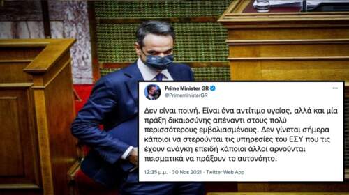 Πόσο υποκριτής, διχαστικός και ψεύτης! Επέβαλε πρόστιμο στους άνω των 60 ανεμβολίαστους, ρίχνοντας σε αυτούς την ευθύνη για την κατάσταση της πανδημίας στη χώρα και το ότι δεν ενίσχυσε τα δημόσια νοσοκομεία! Το ΕΣΥ υποβαθμίζεται συνειδητά από την πολιτική του. Η πανδημία δεν είναι πανδημία ανεμβολίαστων, όλοι μπορούν να νοσήσουν. Άθλιος…