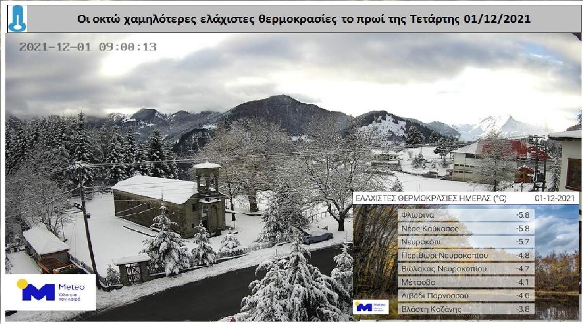 Σύμφωνα με το δίκτυο αυτόματων μετεωρολογικών σταθμών του Εθνικού Αστεροσκοπείου Αθηνών / meteo.gr, πτώση σημείωσαν οι ελάχιστες θερμοκρασίες την Τετάρτη 01/12, με τον υδράργυρο να πλησιάζει τοπικά στους -6 βαθμούς Κελσίου. Στη όμορφη εικόνα από το χιονισμένο Μέτσοβο εμπεριέχεται πίνακας με τις 8 χαμηλότερες ελάχιστες θερμοκρασίες της ημέρας.