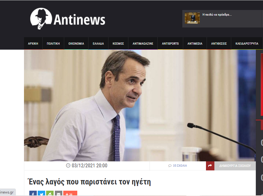 Αν όμως μια “κάργα δεξιά εφημερίδα”, όπως η “Δημοκρατία” βγαίνει με αυτό τον τίτλο, τα πράγματα για την κυβέρνηση δεν ΄είναι όπως μας τα λένε οι δημοσκοπήσεις… Και δεν είναι καθόλου καλά, όπως θα δούμε στη συνέχεια, όταν πλάι στη “Δημοκρατία” υπάρχει το antinews, που υπογράφει ως μέσο (δηλαδή δεν είναι άποψη ενός σχολιογράφου) άρθρο με τον τίτλο “Ένας λαγός που παριστάνει τον ηγέτη”!