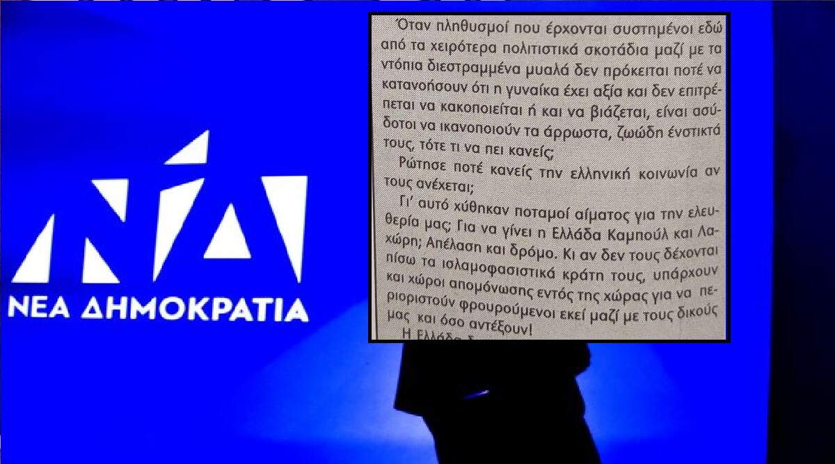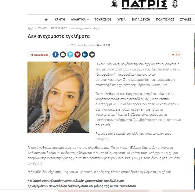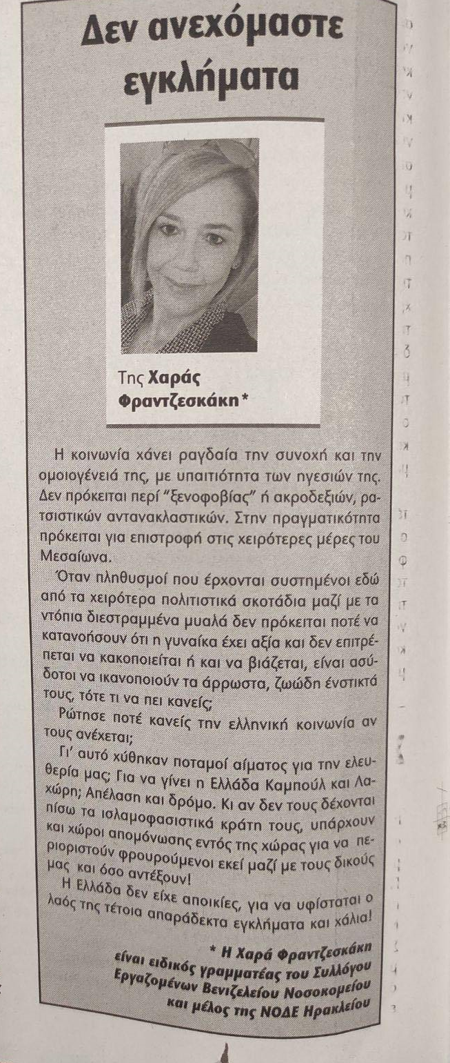 “Ρώτησε ποτέ κανείς την ελληνική κοινωνία αν τους ανέχεται;”, αναφέρεται στο κείμενο που υπογράφει η Χαρά Φραντζεσκάκη, ειδική γραμματέας του Συλλόγου Εργαζομένων Βενιζελείου Νοσοκομείου και μέλος της ΝΟΔΕ Ηρακλείου της ΝΔ. Και εννοεί τους πρόσφυγες και μετανάστες “που έρχονται συστημένοι εδώ από τα χειρότερα πολιτιστικά σκοτάδια” και τους χρεώνει τις κακοποιήσεις και τους βιασμούς των γυναικών!