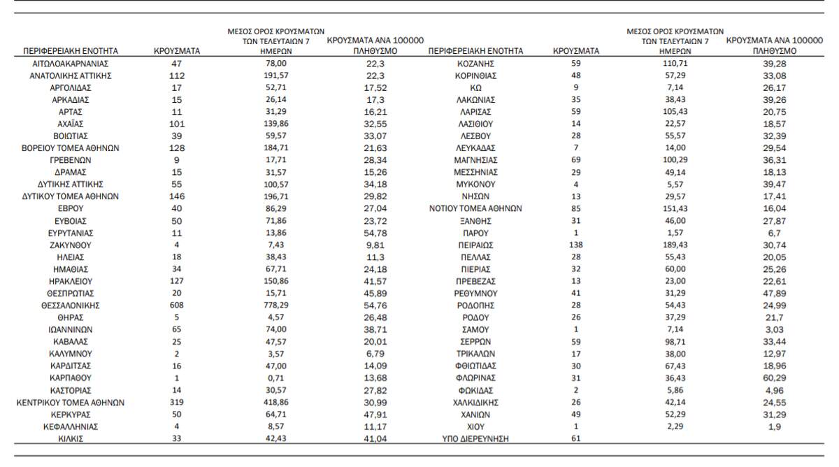Τα νέα εργαστηριακά επιβεβαιωμένα κρούσματα της νόσου που καταγράφηκαν τις τελευταίες 24 ώρες είναι 3.225 , εκ των οποίων 7 εντοπίστηκαν κατόπιν ελέγχων στις πύλες εισόδου της χώρας. Ο συνολικός αριθμός των κρουσμάτων ανέρχεται σε 1.002.877 (ημερήσια μεταβολή +0.3%), εκ των οποίων 50.5% άνδρες. Με βάση τα επιβεβαιωμένα κρούσματα των τελευταίων 7 ημερών, 88 θεωρούνται σχετιζόμενα με ταξίδι από το εξωτερικό και 2.730 είναι σχετιζόμενα με ήδη γνωστό κρούσμα.