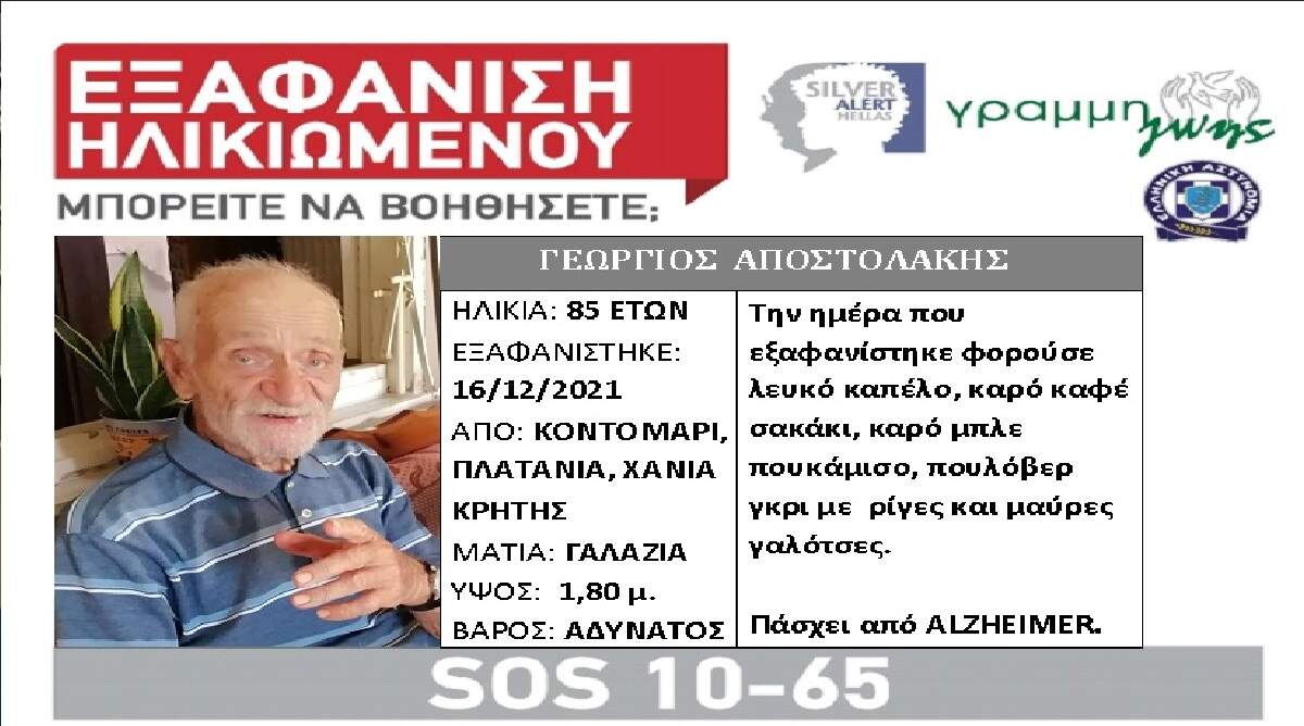 Ο Γεώργιος Αποστολάκης, 85 ετών, εξαφανίστηκε από το σπίτι του, στην περιοχή Κοντομαρί του Δήμου Πλατανιά στα Χανιά, την 16/12/21.