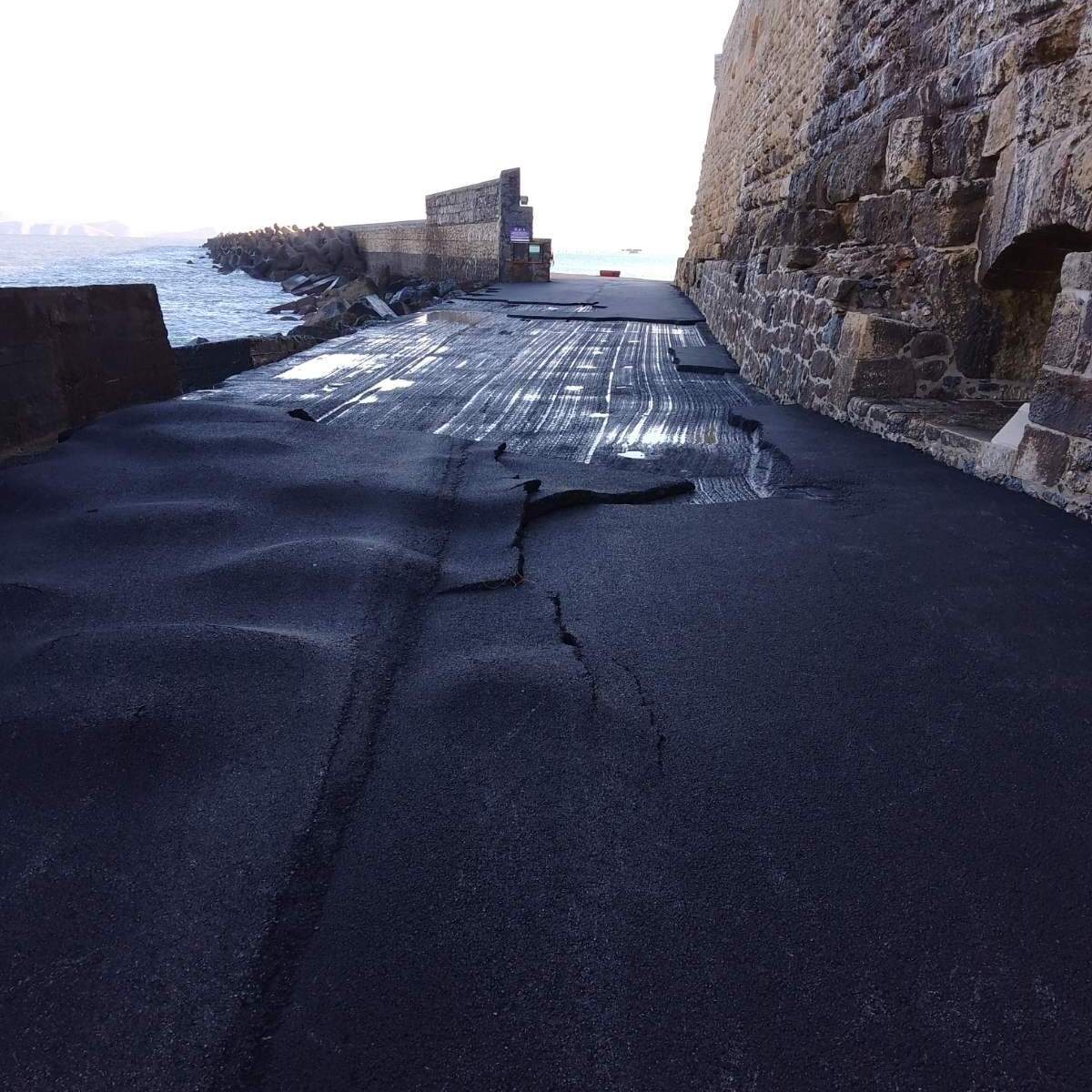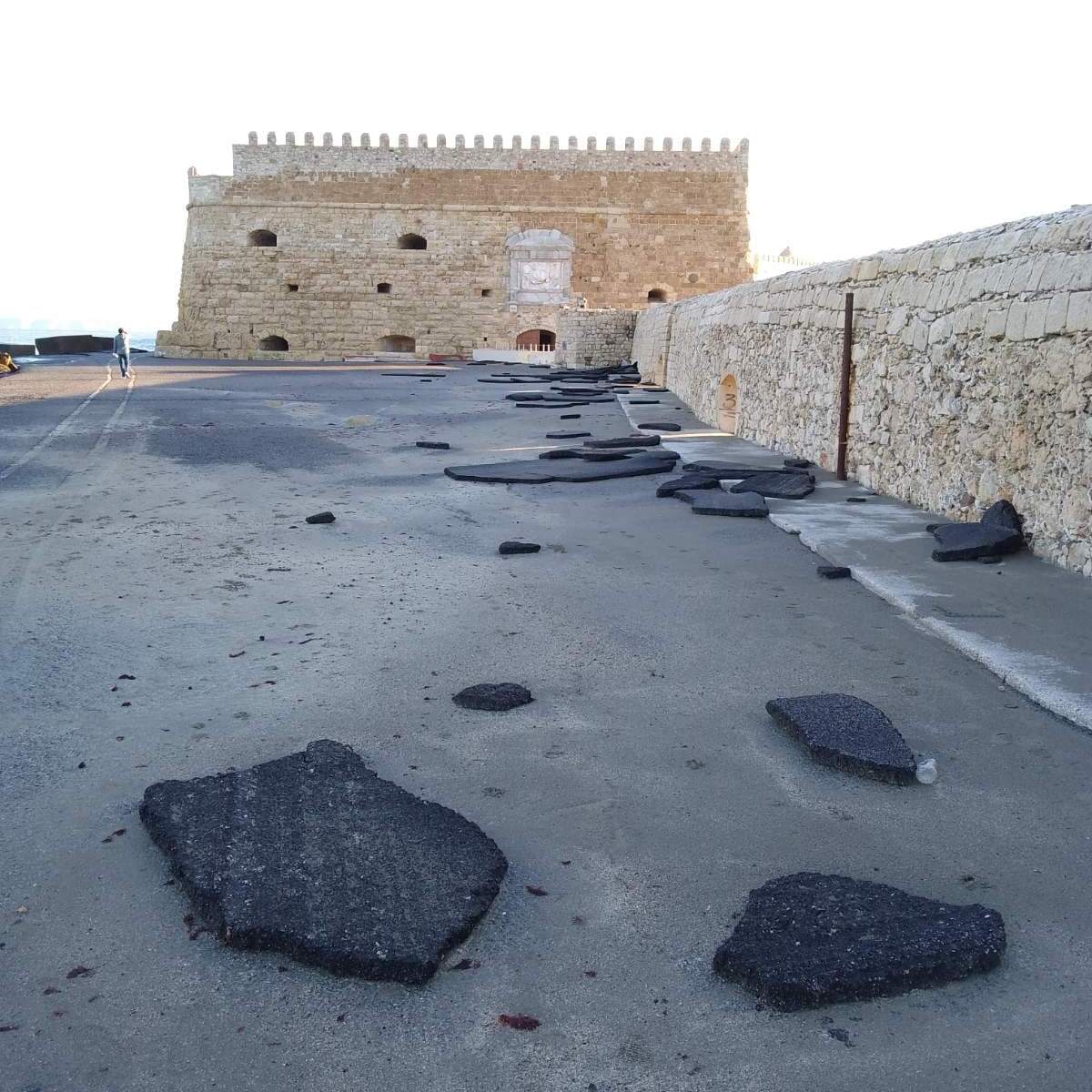 Όπως φαίνεται στις φωτογραφίες που δημοσιεύει πολίτης στο γκρουπ των Μετεωκρητών στο Facebook, οι θυελλώδεις άνεμοι και τα μανιασμένα κύματα είχαν ως αποτέλεσμα να αποκολληθεί ο πρόσφατος ασφαλτοτάπητας και να μετακινηθεί από την θέση του.
