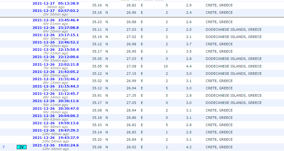 | Distances | 168 km E of Irákleion, Greece / pop: 137,000 / local time: 00:46:52.2 2021-12-27 48 km SSW of Karpathos, Greece / pop: 2,200 / local time: 00:46:52.2 2021-12-27 |