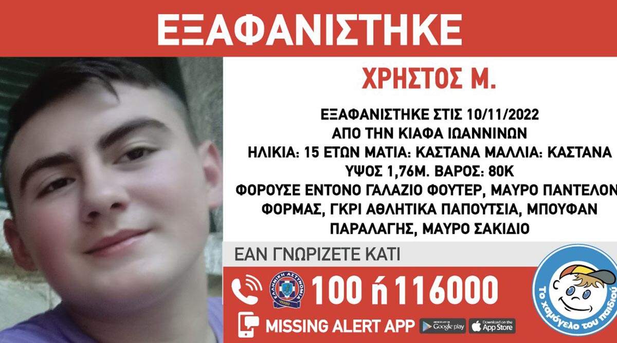 Στις 10/01/2022, πρωινές ώρες, εξαφανίστηκε από την περιοχή Κιάφα Ιωαννίνων, ο Χρήστος Μ., 15 ετών.