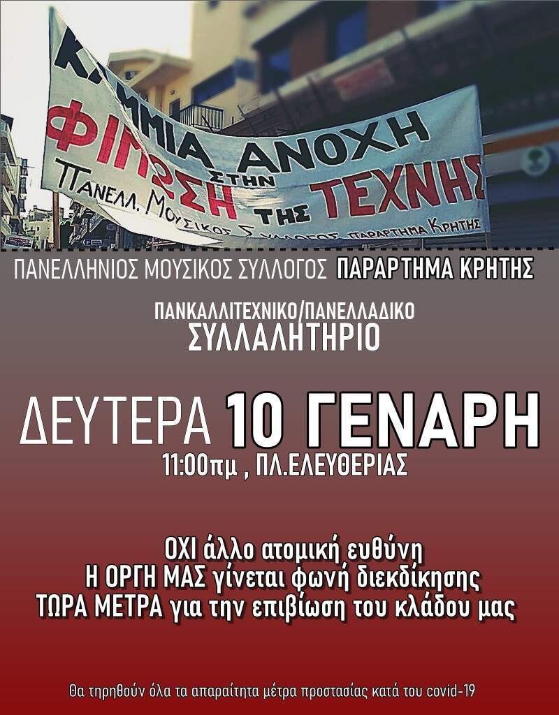 Συλλαλητήριο ενάντια στα μέτρα της κυβέρνησης που ενοχοποιεί μουσικούς και μουσική, πραγματοποίησε χθες στο Ηράκλειο το παράρτημα Κρήτης του Πανελλήνιου Μουσικού Συλλόγου, στην πλατεία Ελευθερίας.