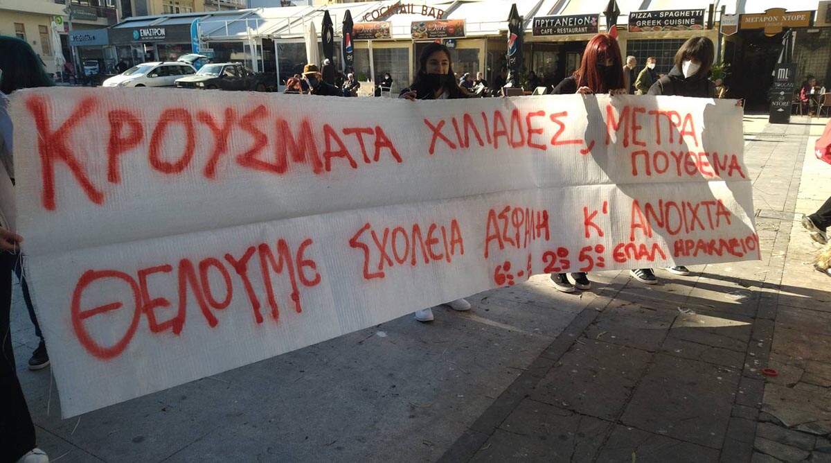 Δεκάδες μαθητές από διάφορα σχολεία του Ηρακλείου συναντήθηκαν σήμερα στον δρόμο του αγώνα. Συγκεκριμένα μαθητές από το 1ο ΓΕΛ (Καπετανάκειο), 3ο ΓΕΛ, ΓΕΛ και Γυμνάσιων Μελεσών, Καλλιτεχνικό και Μουσικό Σχολείο, από το 2ο, 4ο, 5ο και 6ο ΕΠΑΛ, είτε κάνοντας κατάληψη, είτε αποχή κατέβηκαν στον δρόμο, συγκεντρώθηκαν στην Πλατεία Ελευθερίας για να διαδώσουν τα αιτήματά τους για ασφαλή σχολεία.