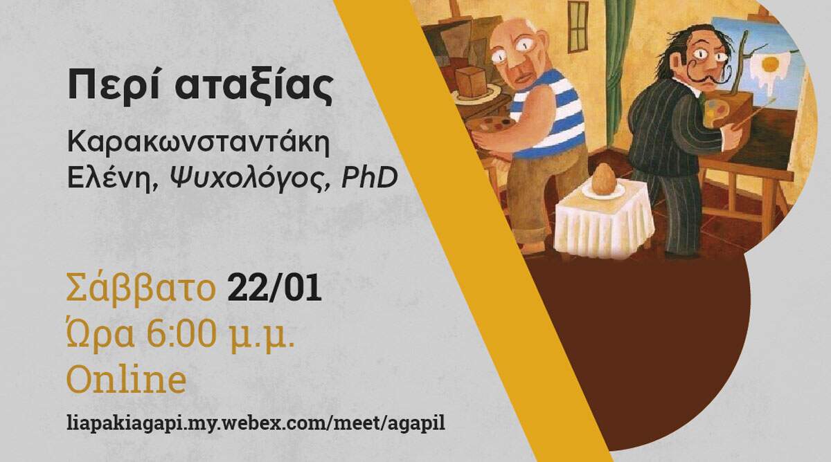 Για τη διαδικτυακή ομιλία με τίτλο “Περί αταξίας” το Σάββατο 22/1/2022 στις 18:00 συνδεθείτε εδώ: