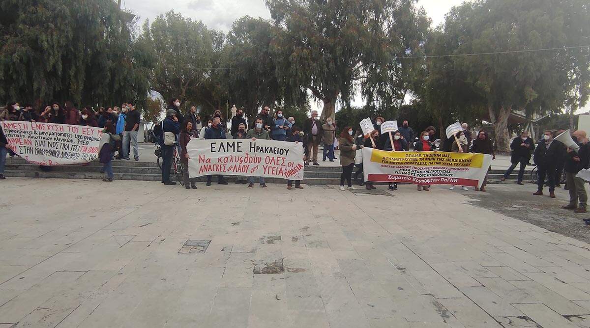 Συγκέντρωση διαμαρτυρίας με συμβολική πορεία στο κέντρο του Ηρακλείου πραγματοποιήθηκε σήμερα με αφορμή την Πανελλαδική Ημέρα Δράσης για την Υγεία που προκήρυξαν με 3ωρη στάση εργασίας ΑΔΕΔΥ-ΠΟΕΔΗΝ και Ν.Τ. ΑΔΕΔΥ Ηρακλείου. Στη συγκέντρωση παραβρέθηκαν το Σωματείο Εργαζομένων ΠΑΓΝΗ, η Ένωση Γιατρών ΕΣΥ, η ΕΛΜΕ, το Σύλλογος Εκπαιδευτικών A’Βάθμιας Εκπαίδευσης Ηρακλείου “Δομήνικος Θεοτοκόπουλος” και ο Σύλλογος Φοιτητών Ιατρικής Πανεπιστημίου Κρήτης.